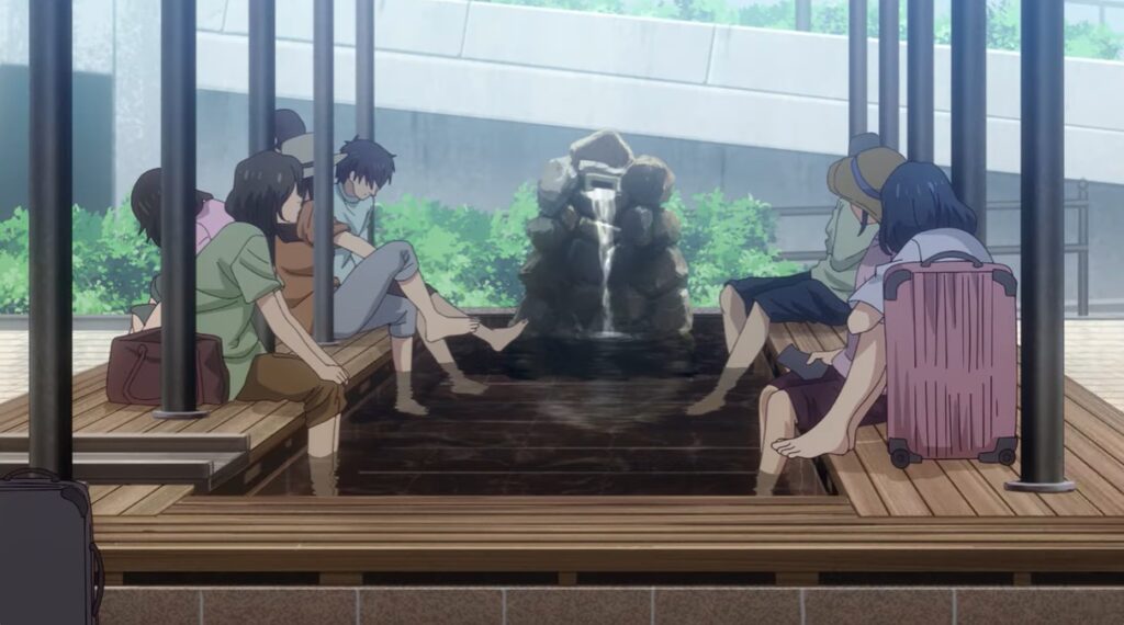 PV第2弾の冒頭付近で、足湯の前を綿花奈が横切るカットがあります。