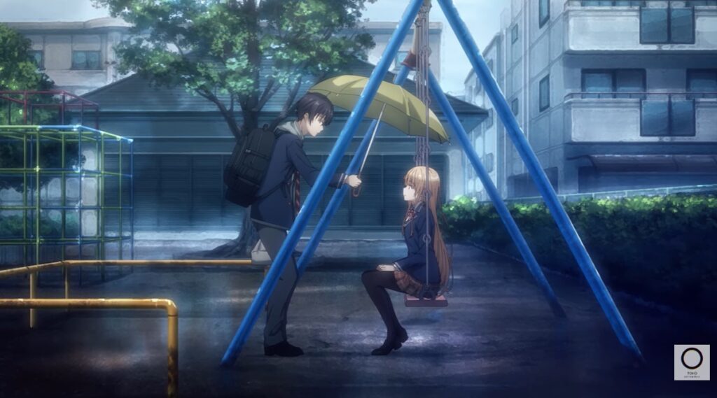 第1話冒頭、周が雨の中、ずぶ濡れのままブランコに座る真昼を見つけるシーンがあります。