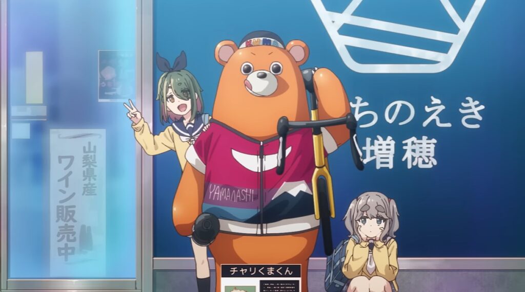 特報PVの23秒あたり、メイと絵真が「チャリくまくん」と写るカットがあります。